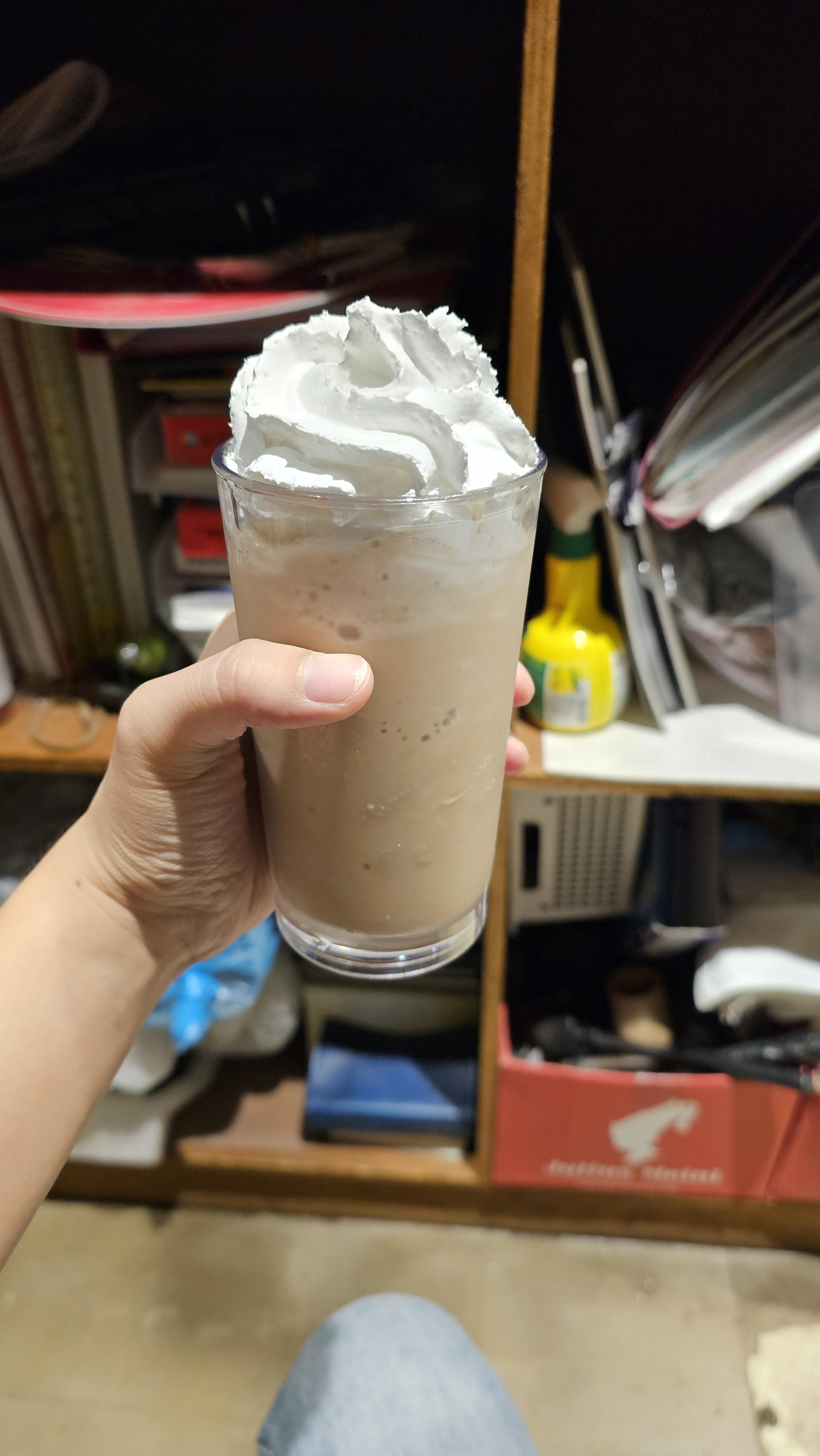 4. 휘핑크림으로 마무리! : 믹서기에서 블렌딩한 음료를 레귤러 잔에 부은 후, 그 위에 휘핑크림을 얹습니다. 휘핑크림은 음료의 달콤함을 한층 더 해주면서 부드러운 식감을 선사합니다. 휘핑 위에 따로 추가로 뿌려야 할 파우더는 없으니 간단하게 즐기실 수 있습니다.