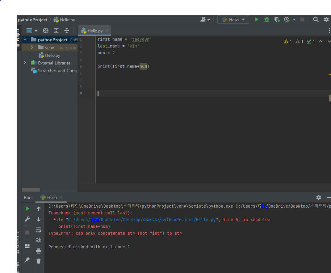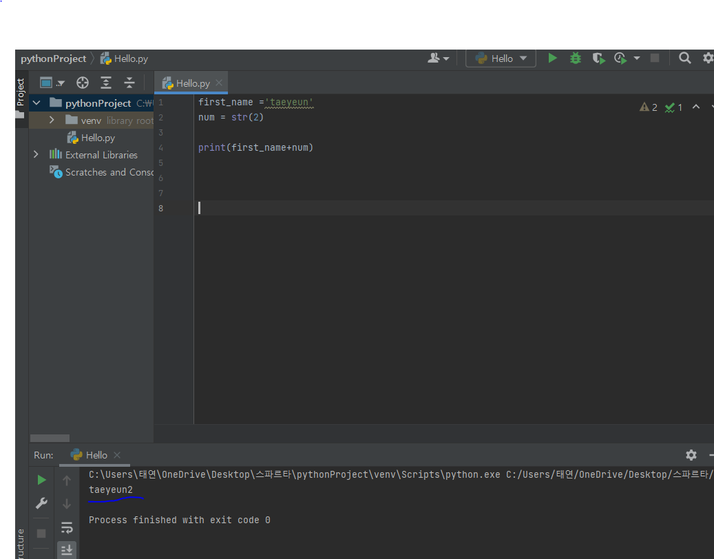 첫번쨰 사진과 다르게 num = str(2) 라고 설정 후, print(first_name+num) 하고 run 눌러보니..그때서야 원하는 답이 나오더라구요...
